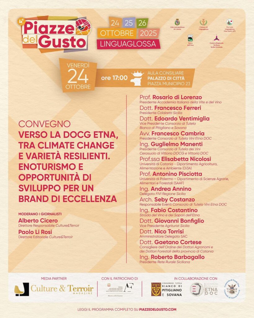 È tutto pronto per la quarta edizione di Piazze del Gusto l’appuntamento enogastronomico che si svolgerà a Linguaglossa dal 24 al 26 ottobre. Un viaggio tra i sapori nel centro storico della città di Linguaglossa, piazze e vie allestite per dare al visitatore la possibilità di apprezzare l’elevato pregio dei prodotti e dei preparati della nostra tradizione. Vino, olio extravergine d’oliva, nocciola e salsiccia garantiscono quel gusto unico che solo le caratteristiche pedoclimatiche del versante Nord Dell’Etna, riesce a dare. “La quarta edizione di Piazza del Gusto – afferma il Sindaco Luca Stagnitta – conferma la volontà dell’Amministrazione Comunale di dare costanza alla promozione dell’agroalimentare di qualità attraverso questa manifestazione che si caratterizza per aver da sempre voluto coniugare il gusto con le bellezze architettoniche di Linguaglossa. La manifestazione è anche il risultato di una proficua collaborazione, durante tutto l’anno, con istituti scolastici, produttori, commercianti, artigiani e associazioni”, conclude il primo cittadino. Tra i tanti eventi, qui il programma completo www.piazzedelgusto.com, un importante convegno, venerdì 24 alle ore 17 nel Palazzo comunale dal titolo: “Verso la DOCG Etna, tra climate change e varietà resilienti. Enoturismo ed opportunità di sviluppo per un brand d’eccellenza”, con ospiti relatori di rilievo nazionale. Sabato 25 alle ore 10 l’inaugurazione di: “Conosciamo la Trainara, antico sentiero Dell’Etna.” Piazze del Gusto, un piccolo villaggio dei sapori che vi aspetta a Linguaglossa dal 24 al 26 Ottobre, con una vasta gamma di prodotti con marchio di tutela (Doc, Dop, Presidio Slow-Food) per trascorrere un weekend all’insegna del buon vino e del buon cibo.