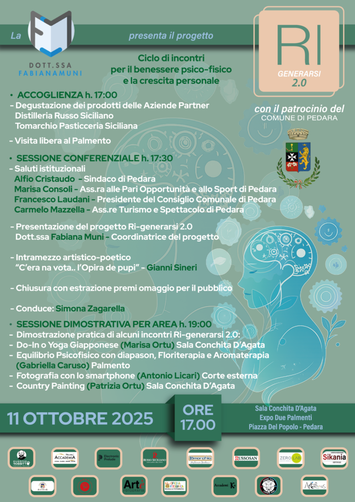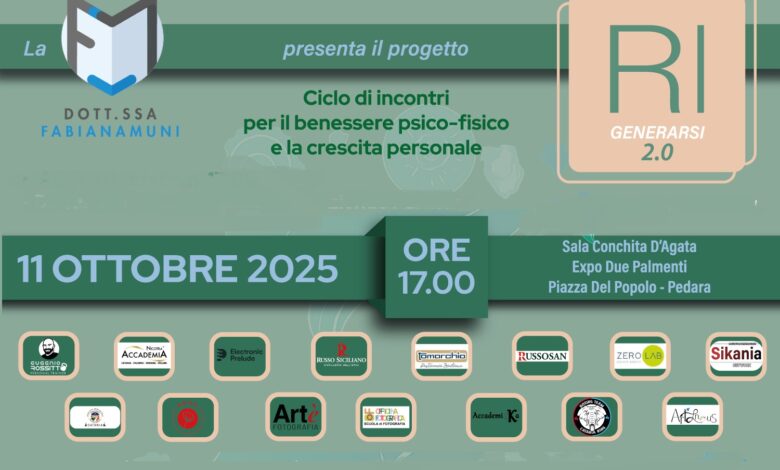Si terrà sabato 11 ottobre 2025, alle ore 17:00, presso la Sala Conchita D’Agata – Expo Due Palmenti (Piazza del Popolo, Pedara), la conferenza di presentazione di RI-GENERARSI 2.0, seconda edizione del progetto ideato e promosso dalla dott.ssa Fabiana Muni, pedagogista e scrittrice catanese.