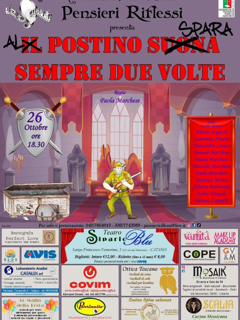 La compagnia teatrale Pensieri Riflessi torna sul palcoscenico del Teatro Sipario Blu di Via F. Ventorino a Catania. Ad inaugurare la nuova stagione 2025-2026, domenica 26 ottobre alle 18.30, sarà Al postino spara sempre due volte. Una pièce brillante sul modello inglese fatta di equivoci e risate, movimento, entrate e uscite di scena. A differenza di Oscar, un fidanzato per due figlie, portata in scena l’anno scorso, in questo nuovo spettacolo protagonista assoluto sarà la confusione a tutto spiano: tanti personaggi presenti contemporaneamente in scena e non più personaggi che a turno ruotano attorno ad un unico protagonista.