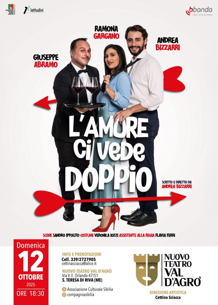 Con la commedia romantica, “L’amore ci vede doppio” di Andrea Bizzarri, con Ramona Gargano e Giuseppe Abramo, si inaugura domenica 12 ottobre a Santa Teresa Riva la nona stagione teatrale del Nuovo Teatro Val d’Agrò con la direzione artistica di Cettina Sciacca. Lo spettacolo inizia alle ore 18.30.