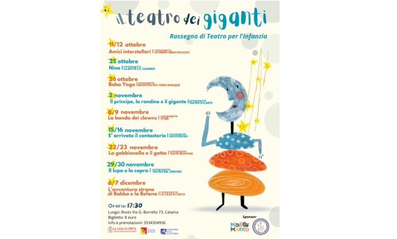 Al via la rassegna teatrale de “Il teatro dei Giganti”, il teatro per le generazioni future, nove spettacoli in cartellone, per il periodo autunnale per poi continuare nel nuovo anno, da gennaio a aprile. La prima performance teatrale l’11 e il 12 ottobre, alle ore 17,30, al Roots, in via Borrello 73, a Catania con ‘Amici interstellari’, prodotto dalla compagnia sarda Effimero Meraviglioso.