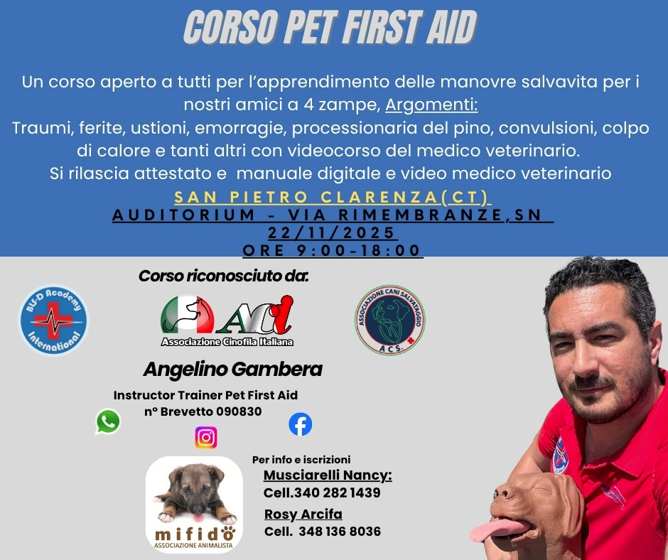 Riconoscere un’emergenza, sapere come agire e avere gli strumenti per intervenire in modo sicuro e tempestivo. Sono questi gli obiettivi del corso di primo soccorso veterinario rivolto a tutti i proprietari di cani, toelettatori, volontari e operatori del settore, in programma sabato 22 novembre 2025, dalle 9:00 alle 18:00, a San Pietro Clarenza, provincia di Catania, nell’Auditorium in via delle Rimembranze.
