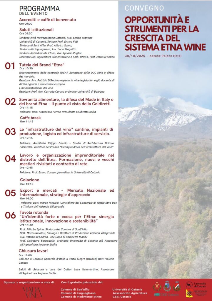 Dopo i saluti istituzionali con il sindaco della Città Metropolitana di Catania Enrico Trantino, il rettore dell’Università di Catania Enrico Foti, il sindaco di Sant’Alfio Alfio La Spina, il sindaco di Linguaglossa Luca Stagnitta, il sindaco di Piedimonte Etneo Ignazio Puglisi, il direttore del Dipartimento Agricoltura Alimentazione e Ambiente Unict Mario D’Amico, il convegno si dividerà in due sessioni.