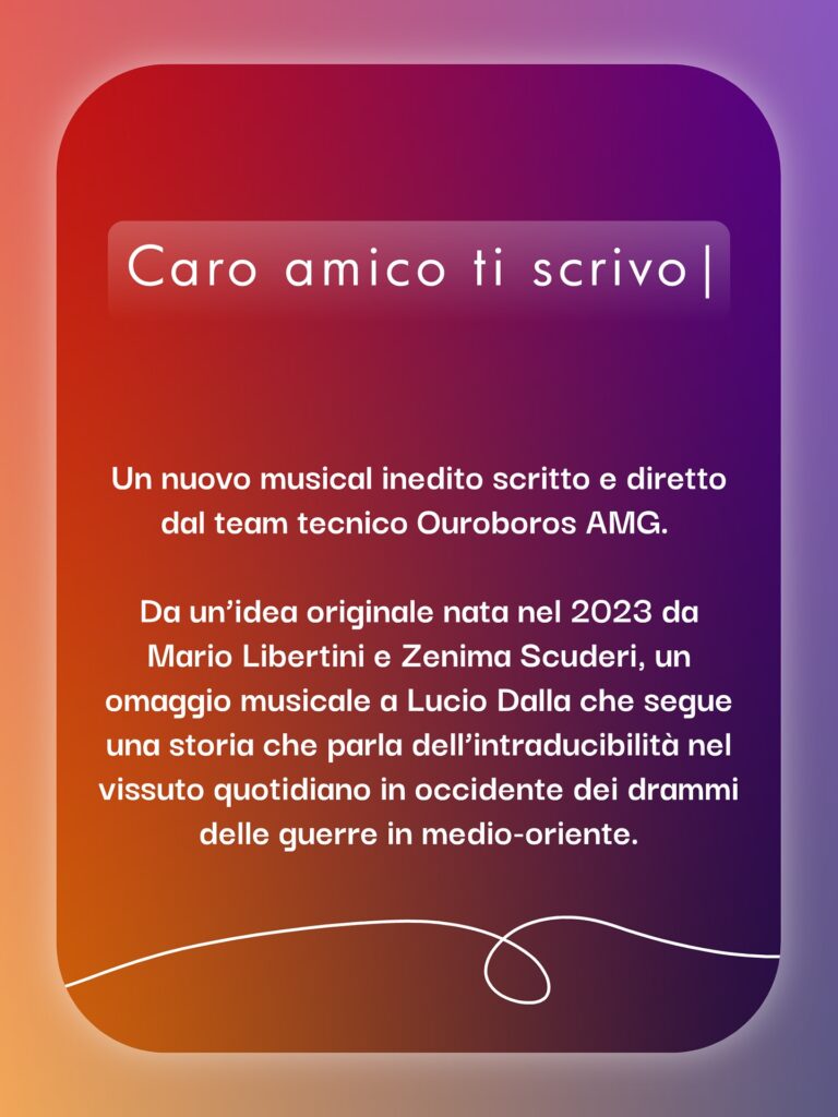 Accanto a questo ritorno, debutta Caro Amico Ti Scrivo, musical inedito ideato da Mario Libertini e Zenima Scuderi. Un omaggio al grande Lucio Dalla, ma anche un racconto intenso e contemporaneo che intreccia musica e riflessione, indagando l’impatto delle guerre in Medio Oriente sulla vita quotidiana in Occidente.