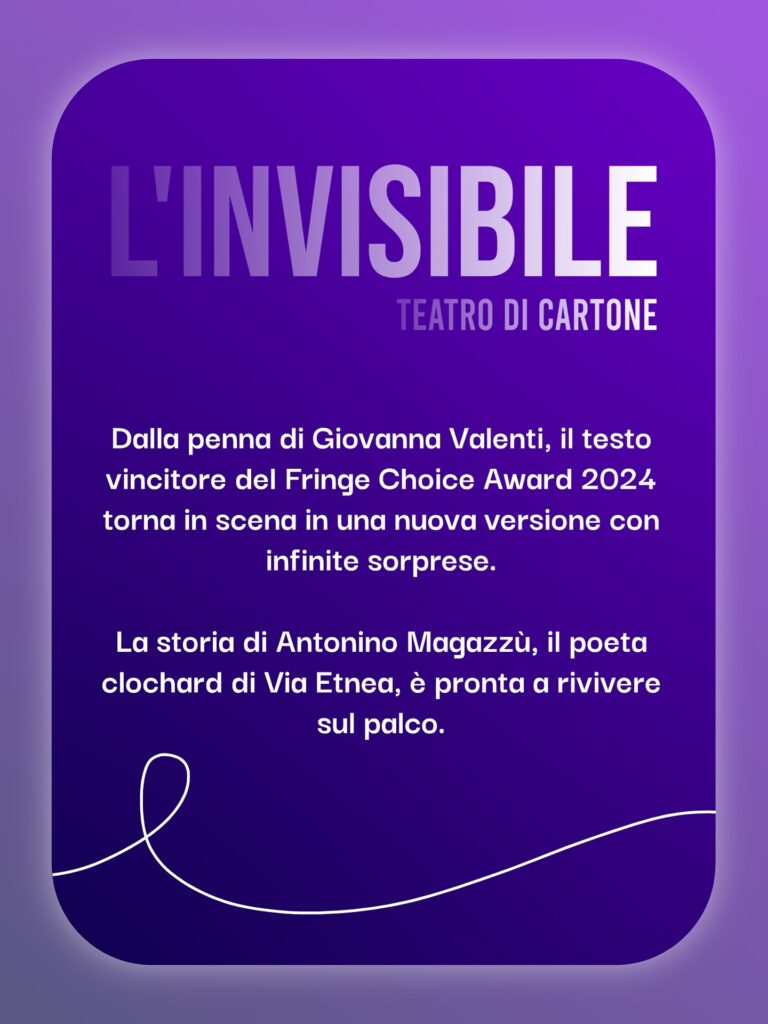 L’Invisibile – teatro di cartone, firmato da Giovanna Valenti, torna in scena in una nuova versione dopo il successo al Fringe Choice Award 2024. Il testo restituisce voce e dignità alla storia vera di Antonino Magazzù, il poeta clochard di via Etnea.