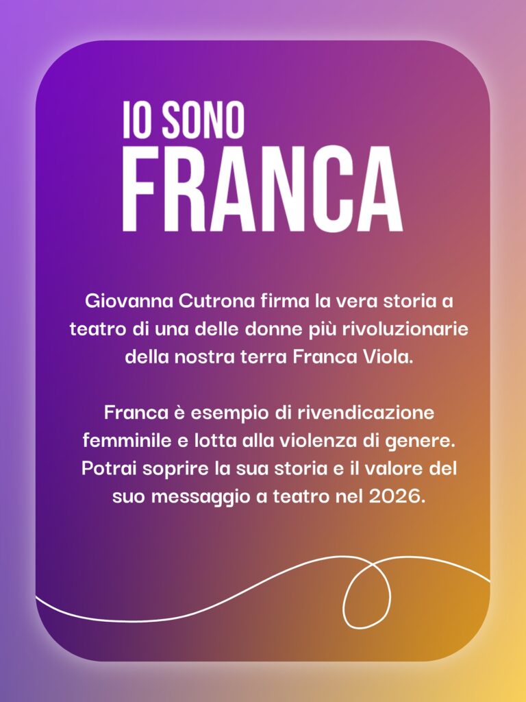 Chiude la stagione Io Sono Franca, scritto da Giovanna Cutrona, dedicato a Franca Viola, simbolo di coraggio e libertà. Un racconto potente di riscatto femminile e di lotta contro la violenza di genere.