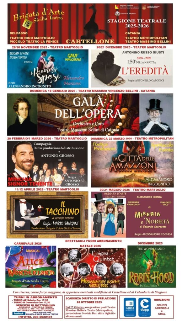 La Brigata d’Arte, inoltre, a novembre inaugurerà la stagione 2025-2026, composta da sette spettacoli che si svolgeranno a Belpasso, al Teatro Nino Martoglio, e a Catania, al Metropolitan e al Bellini. Tra questi “I Promessi Sposi” e “La città delle Amazzoni” firmati da Alessandro Incognito, l’omaggio ad Antonino Russo Giusti nel 150° anniversario della nascita con “L’Eredità” e il galà dell’Opera.