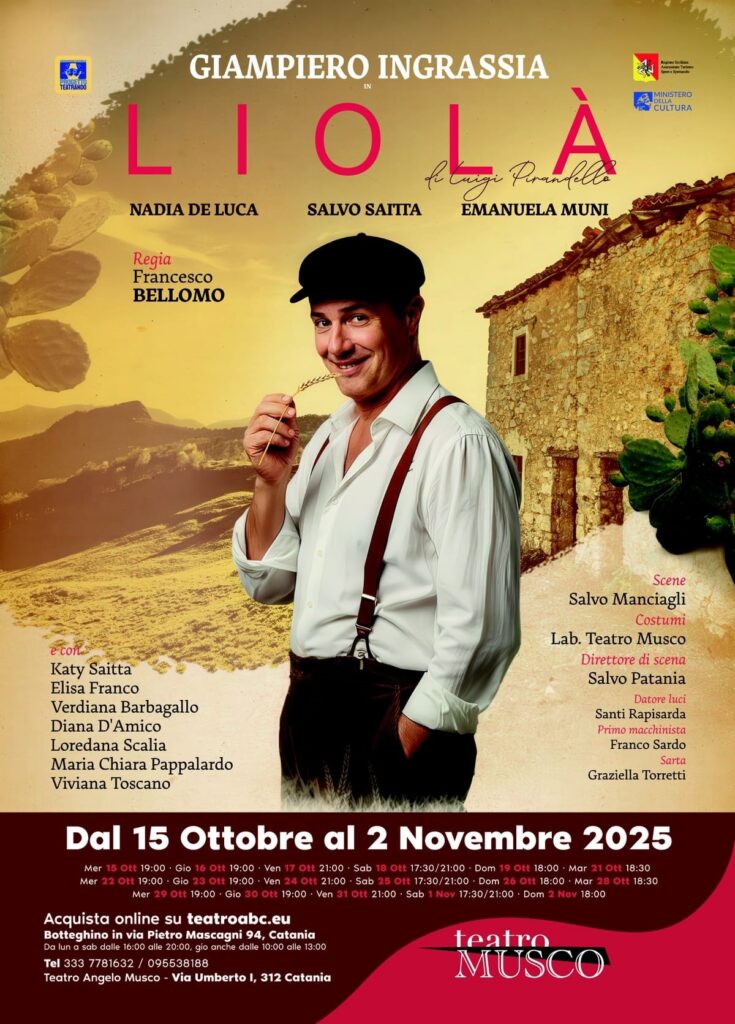 Dal 15 ottobre al 2 novembre 2025, l’Angelo Musco di Catania ospita “Liolà”: opera simbolo della verve pirandelliana, che ha lasciato un segno profondo nella storia del teatro italiano e internazionale. Prodotta dall’Associazione culturale Progetto Teatrando e diretta da Francesco Bellomo, la messa in scena vede GIAMPIERO INGRASSIA nei panni del protagonista, che indossa con leggerezza scanzonata e maturità artistica. Accanto a lui la naturalezza magnetica di Nadia De Luca, il carisma e rigore interpretativo di Salvo Saitta, il talento fuoriclasse di Emanuela Muni. A completare un cast stellare Katy Saitta, Elisa Franco, Verdiana Barbagallo, Diana D’Amico, Loredana Scalia, Maria Chiara Pappalardo e Viviana Toscano.
