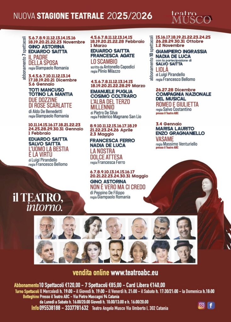 Riparte la nuova stagione al Teatro Musco 2025-2026 con la direzione artistica di Francesca Ferro. Tra innovazione e tradizione, si alza il sipario con dieci spettacoli (di cui due al Teatro Abc) ospitati nella sede di via Umberto I, 312, Catania, dove un’attenzione particolare è rivolta al rapporto con il pubblico. In un dialogo che non si chiude mai nel formalismo, ma apre alla vitalità della scena e all’immediatezza dell’incontro con capolavori senza tempo.