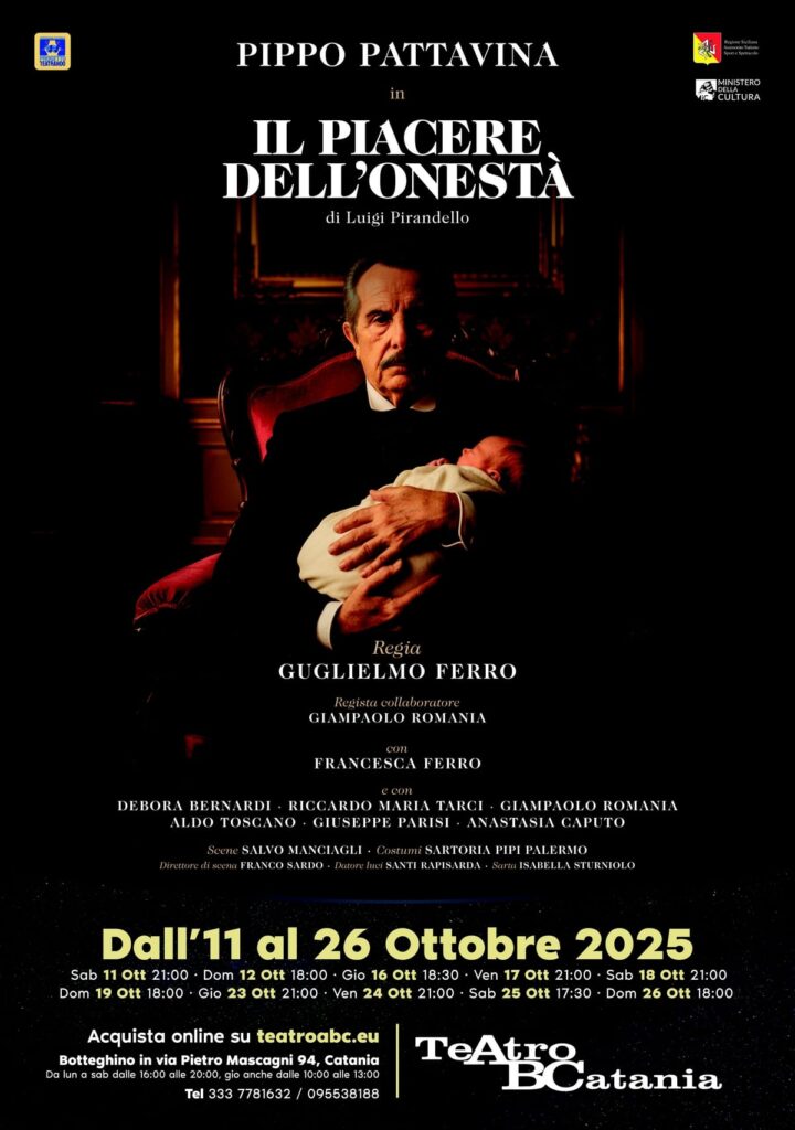 Dall’11 al 26 ottobre 2025, l’Abc di Catania ospita la rappresentazione di una delle opere più emblematiche del geniale drammaturgo agrigentino. “Il piacere dell’onestà”, un’eccellente produzione dell’Associazione culturale Progetto Teatrando, con un Maestro del teatro come PIPPO PATTAVINA, interprete poliedrico e di grande levatura artistica, supportato da una superba Francesca Ferro e da un cast di assoluto livello composto da Debora Bernardi, Riccardo Maria Tarci, Giampaolo Romania, Aldo Toscano, Giuseppe Parisi e Anastasia Caputo.