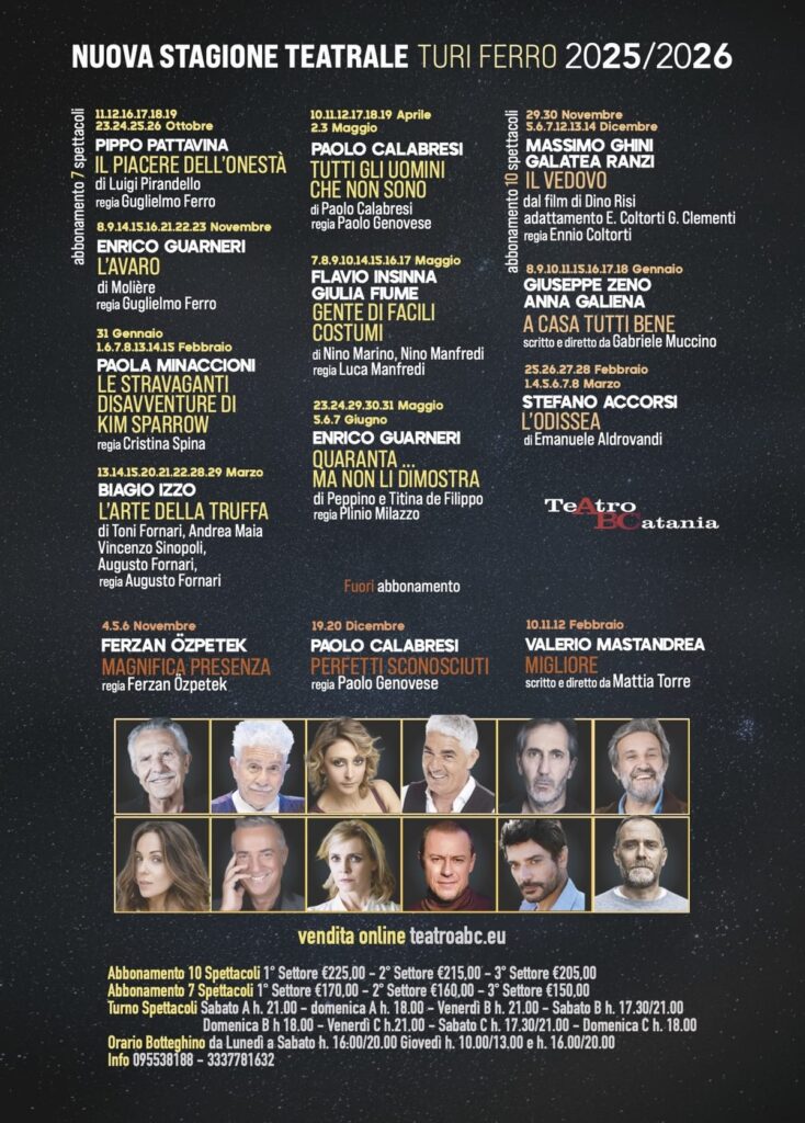 Si alza il sipario sulla nuova stagione teatrale Turi Ferro 2025-2026 all’Abc di Catania. Nove mesi di ricchissima programmazione ospitata nella sede di via Pietro Mascagni, 94. Tredici spettacoli che compongono un cartellone di nomi di prima grandezza nel panorama italiano e internazionale.Proposte artistico-culturali di indiscusso pregio che spaziano mirabilmente tra generi e linguaggi differenti, attingendo alla straordinaria tradizione di un teatro sempreverde che in Sicilia trova rinnovata linfa e nutrimento.