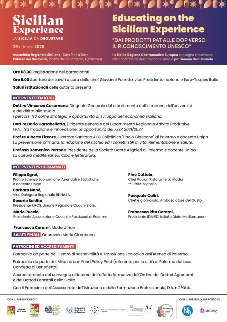 Normanni (Palermo) Convegno Educating on the Sicilian Experience presso la, dal titolo: “Dai prodotti PAT alle DOP attraverso il riconoscimento UNESCO”. Interverranno: l’on. Mario Giambona; Vincenzo Cusumano, Dirigente Generale del dipartimento dell’istruzione, dell’università e del diritto allo studio; Dario Cartabellotta, Dirigente generale del Dipartimento Regionale Attività Produttive; Alberto Firenze, Direttore Sanitario AOU Policlinico “Paolo Giaccone” di Palermo e docente Unipa; Domenica Perrone, presidente della Società Dante Alighieri di Palermo e docente Unipa; Filippo Sgroi, prof. Scienze Economiche, Aziendali e Statistiche e docente Unipa; Barbara Nane, vice Delegata Regionale RE.NA.I.A.; Rosario Seidita, presidente URCS, Unione Regionale Cuochi Sicilia; Mario Puccio, presidente Associazione Cuochi e Pasticceri di Palermo; Pino Cuttaia, chef patron ristorante “La Madia (2 stelle Michelin); Pasquale