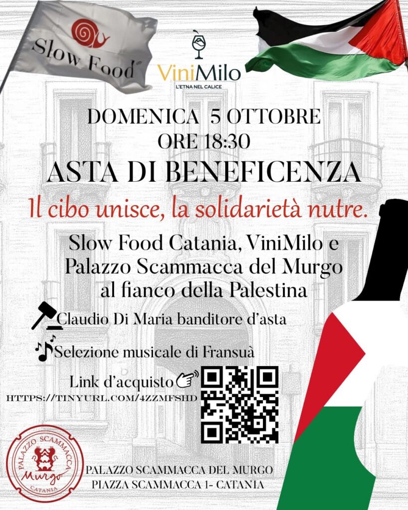 Prosegue la raccolta fondi nata dalla collaborazione con ViniMilo a sostegno della popolazione palestinese. Appuntamento domenica 5 ottobre alle 18.30 presso Palazzo Scammacca del Murgo, in piazza Scammacca 1 Catania, con l’iniziativa di Slow Food Catania a sostegno della Palestina.