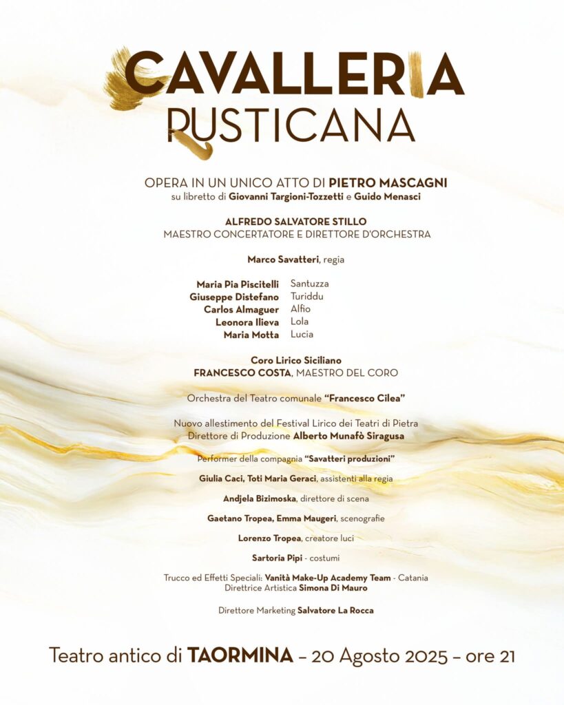 Mercoledì 20, alle ore 21, al Teatro antico di Taormina andranno in scena in successione il “Bolero” di Maurice Ravel e l’opera lirica “Cavalleria Rusticana” di Pietro Mascagni. Regia di Marco Savatteri. Con Maria Pia Piscitelli (Santuzza), Giuseppe Distefano (Turiddu), Carlos Almaguer (Alfio), Leonora Ilieva (Lola), Maria Motta (Lucia).